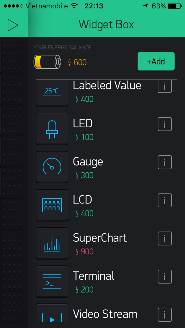 Tiếp tục vào Widget Box (+) > Click vào SUPPERCHART để biểu đồ hiển thị khí Gas.