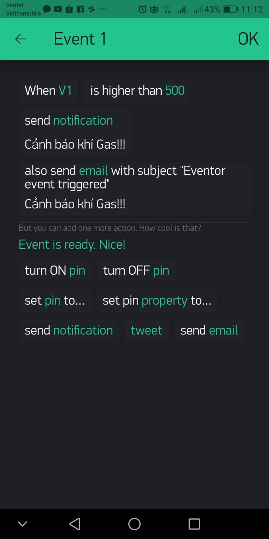 - Ở mục “Eventor Settings”: Ta chọn “Vpin value là V1 is higher than 500” Nếu nồng độ khí Gas cao hơn 500.