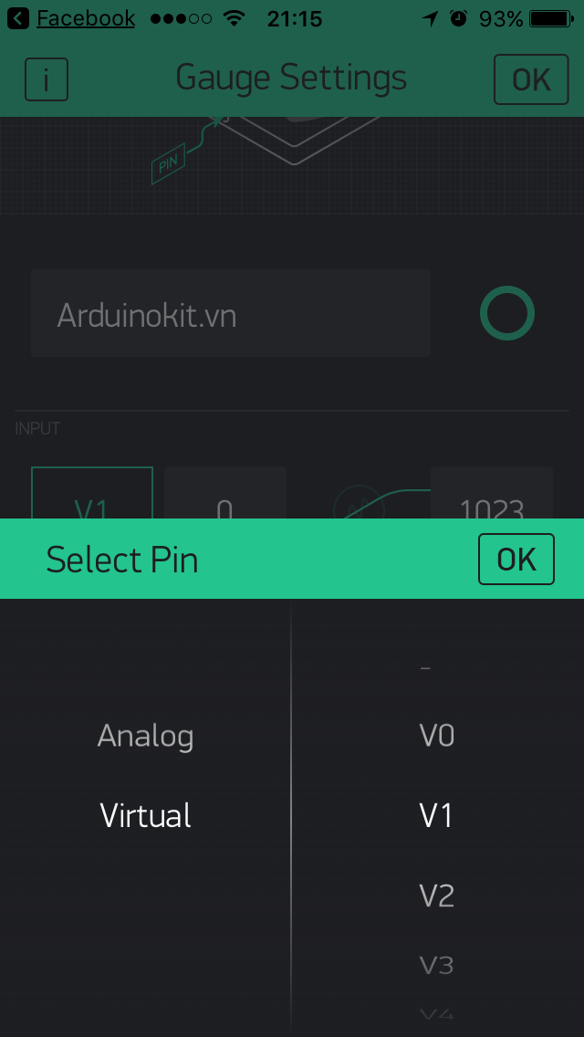 - INPUT: Cấu hình cho PIN cần kết nối, ở đây mình chọn Virtual > V1(0~1023) đổi lại (0~500).