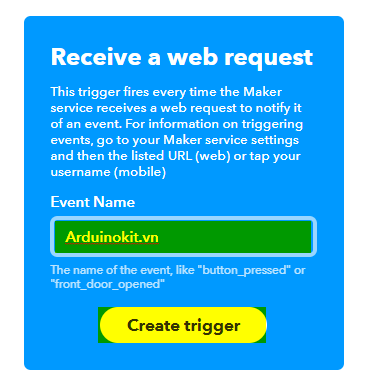 Nhập bất kỳ tên sự kiện nào ở đây mình ghi là “Arduinokit.vn”