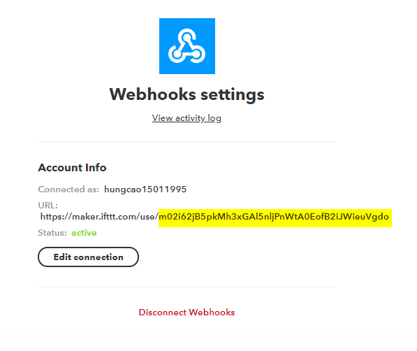Quay lại My Applest > Services > Webhooks vào phần Settings và Copy đoạn mã được bôi đậm như hình, (Lưu đoạn mã vào note để lát sử dụng nhé).