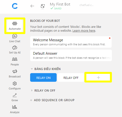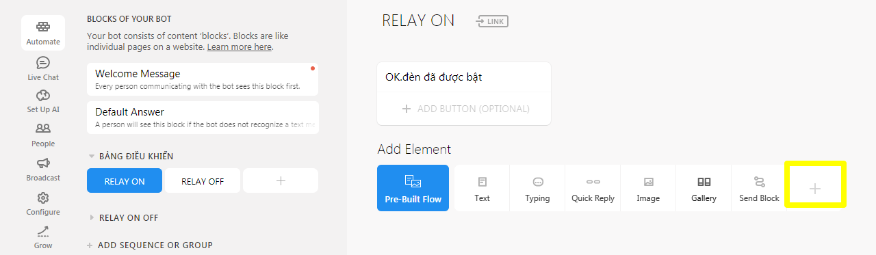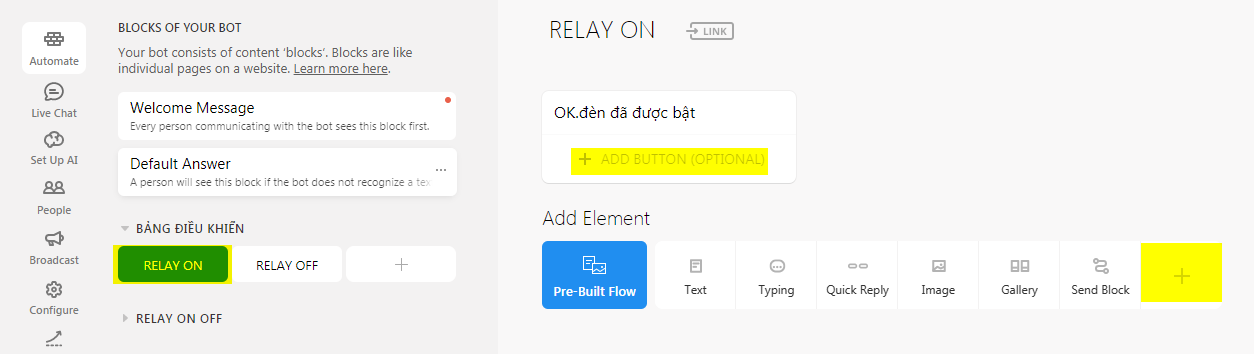 Ở mục Automate chúng ta cần đặt câu lệnh để điều khiển thiết bị.