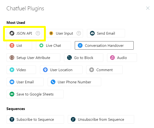 Chọn Relay ON và nhấp vào + đăng nhập và chọn APIJSON từ các Plugin Chatfuel.