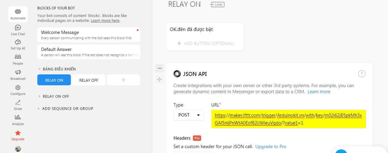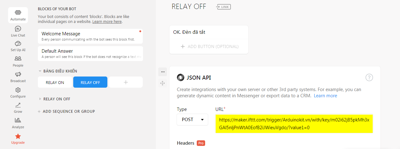 Thiết lập URL cho 2 nút điều khiển RELAY ON và RELAY OFF.