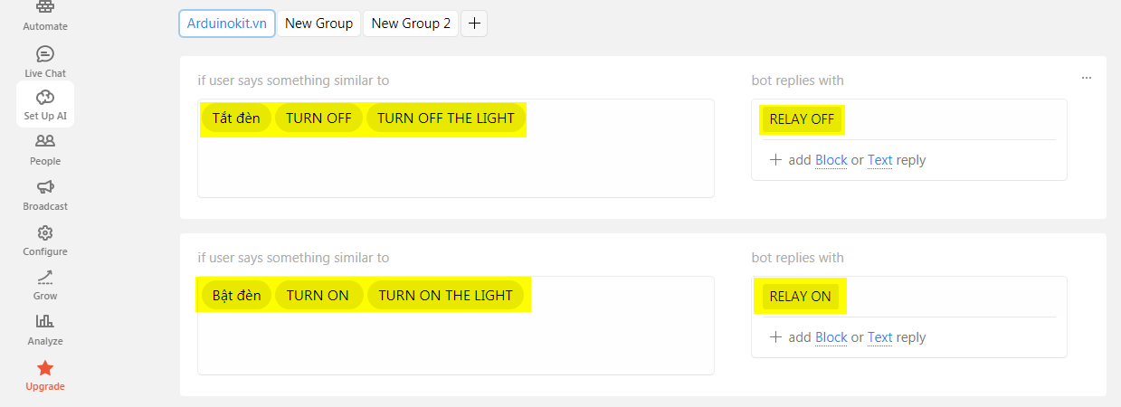 Nhấp vào mục Set Up AI ở bên trái màn hình: Ở phần này các bạn có thể đặt thêm các câu thoại dùng để bật tắt thiết bị.