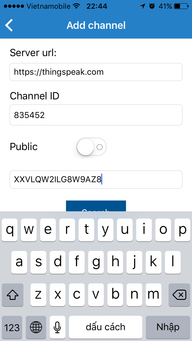 Tiếp theo mở App Thingview chúng ta nhập Channel ID và APY Key vào nhé.