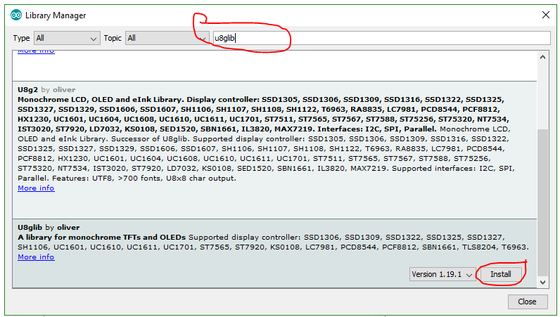 Ở phần này các bạn gõ vào thanh tìm kiếm trên phần mềm arduino “u8glib” kéo xuống phía dưới nhấn INSTALL. Như vậy là đã xong rồi nhé.