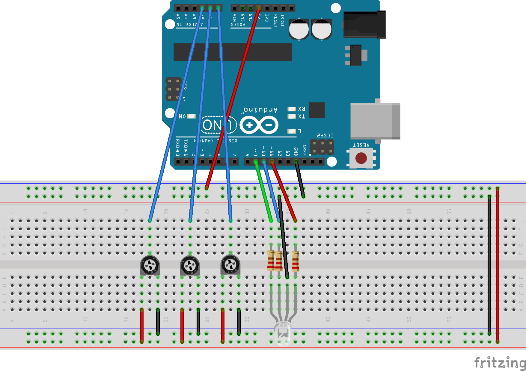 int redPin = 9; // R – digital 9 int greenPin = 10; // G – digital 10 int bluePin = 11; // B – digital 11 int potRedPin = 0; // potentiometer 1 – analog 0 int potGreenPin = 1; // potentiometer 2 – analog 1 int potBluePin = 2; // potentiometer 3 – analog 2 void setup(){ pinMode(redPin,OUTPUT); pinMode(greenPin,OUTPUT); pinMode(bluePin,OUTPUT); Serial.begin(9600); } void loop(){ int potRed = analogRead(potRedPin); int potGreen = analogRead(potGreenPin); int potBlue = analogRead(potBluePin); int val1 = map(potRed,0,1023,0,255); int val2 = map(potGreen,0,1023,0,255); int val3 = map(potBlue,0,1023,0,255); Serial.print("Red:"); Serial.print(val1); Serial.print("Green:"); Serial.print(val2); Serial.print("Blue:"); Serial.println(val3); colorRGB(val1,val2,val3); } void colorRGB(int red, int green, int blue){ analogWrite(redPin,constrain(red,0,255)); analogWrite(greenPin,constrain(green,0,255)); analogWrite(bluePin,constrain(blue,0,255)); }